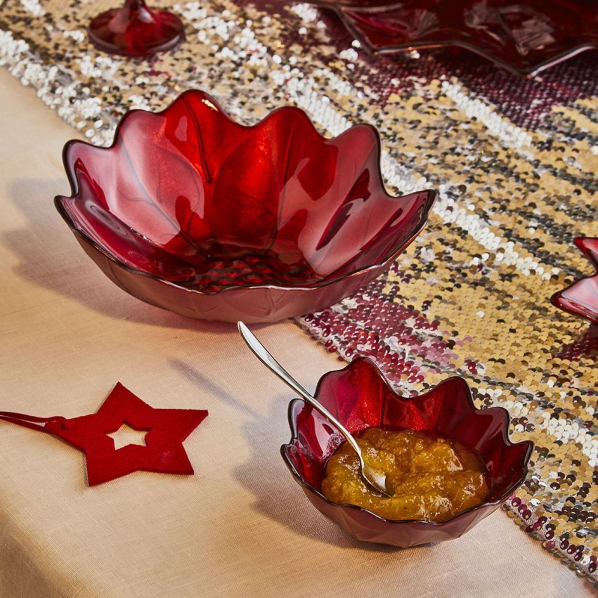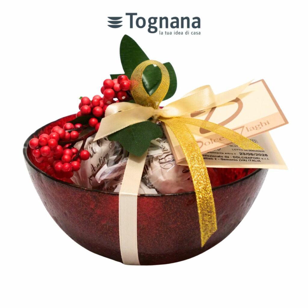 Una ciotola decorata in tema “Red Star”, elegante e luminosa. Contiene 100 g di Brutti & Buoni: un dono pratico, ideale per la tavola delle feste.