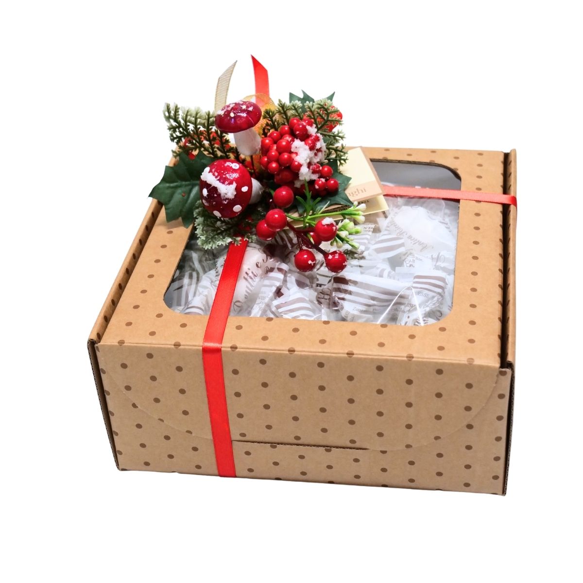 Scatola con motivo a pois e finestra trasparente, perfetta per confezioni regalo dolci o assortimenti.